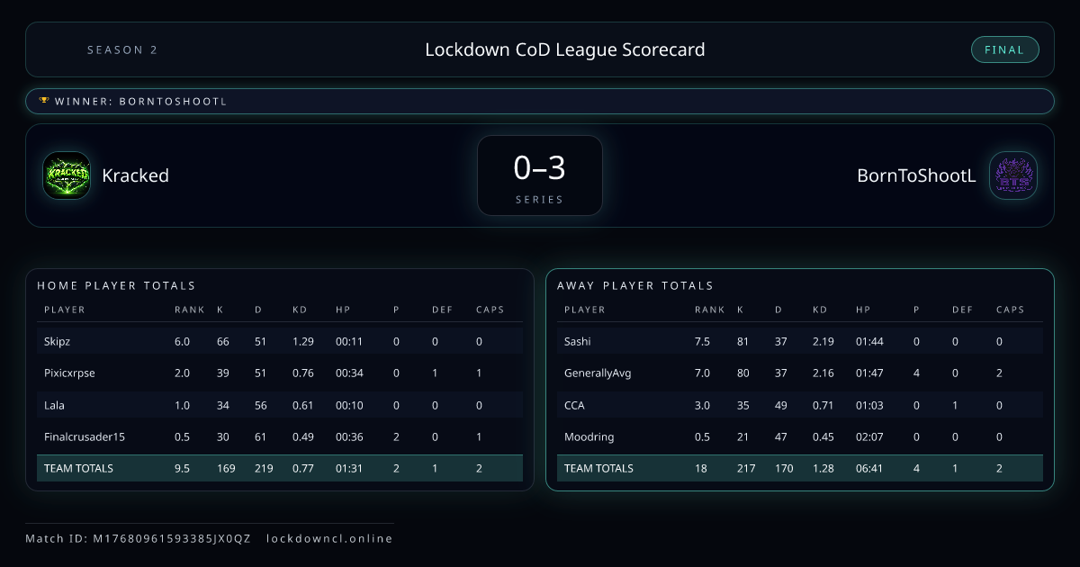 Scoreline: 0 - 3Winner: BornToShootLMatch ID: M17680961593385JX0QZ