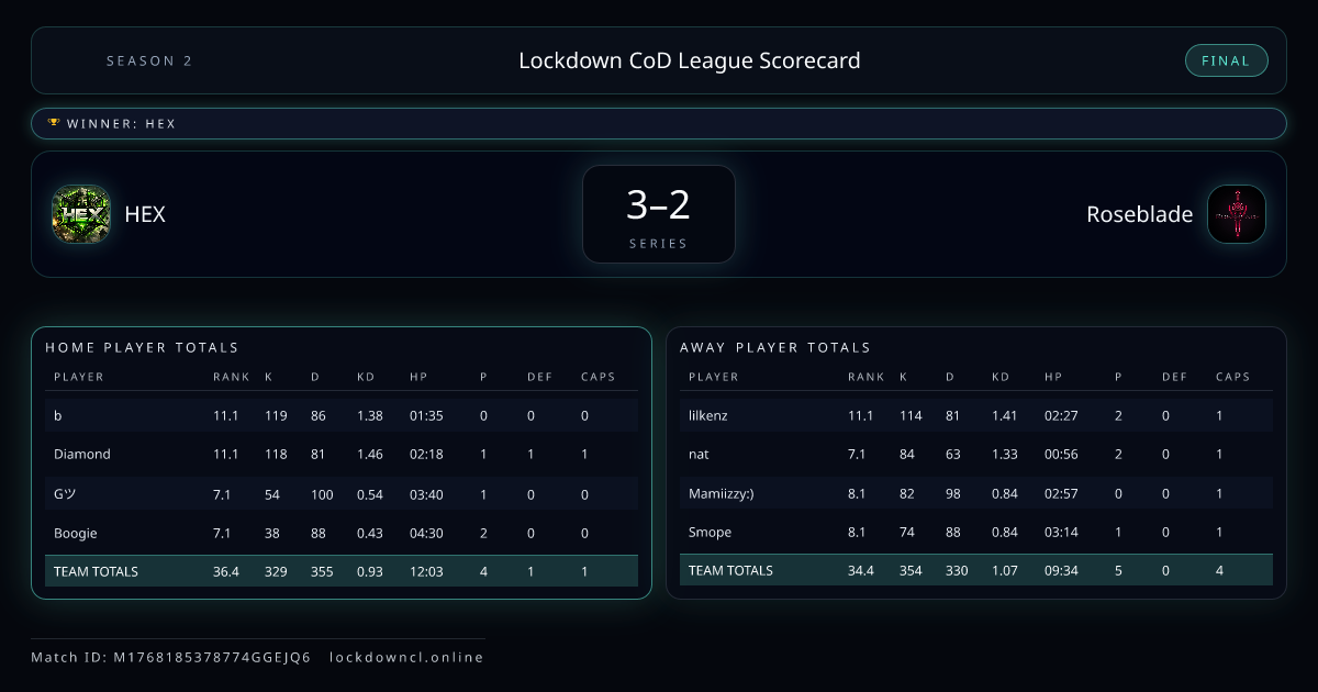 Scoreline: 3 - 2Winner: HEXMatch ID: M1768185378774GGEJQ6