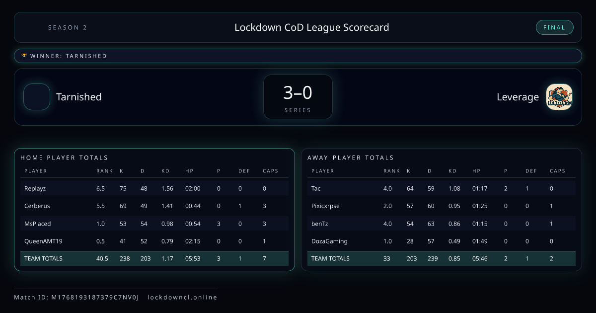 Scoreline: 3 - 0Winner: TarnishedMatch ID: M1768193187379C7NV0J