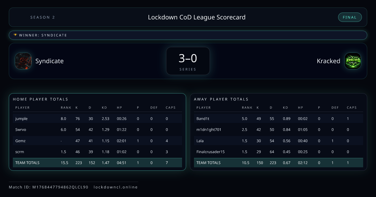 Scoreline: 3 - 0Winner: SyndicateMatch ID: M1768447794862QLCL90