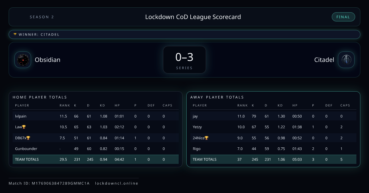 Scoreline: 0 - 3Winner: CitadelMatch ID: M1769063847289GMMC1A