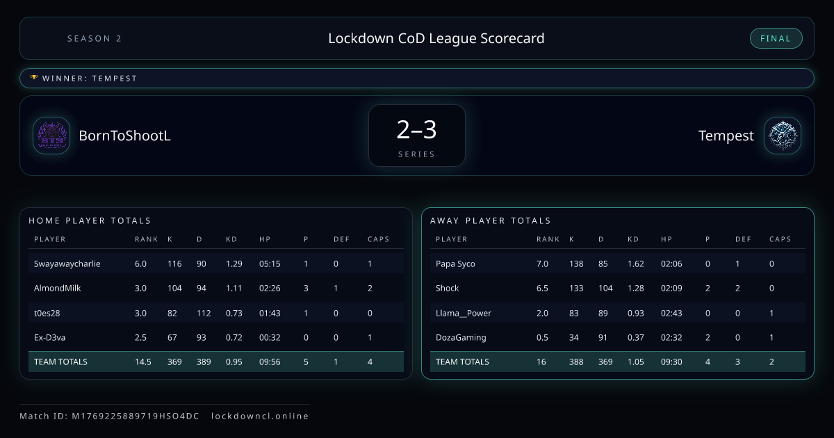 Scoreline: 2 - 3Winner: TempestMatch ID: M1769225889719HSO4DC