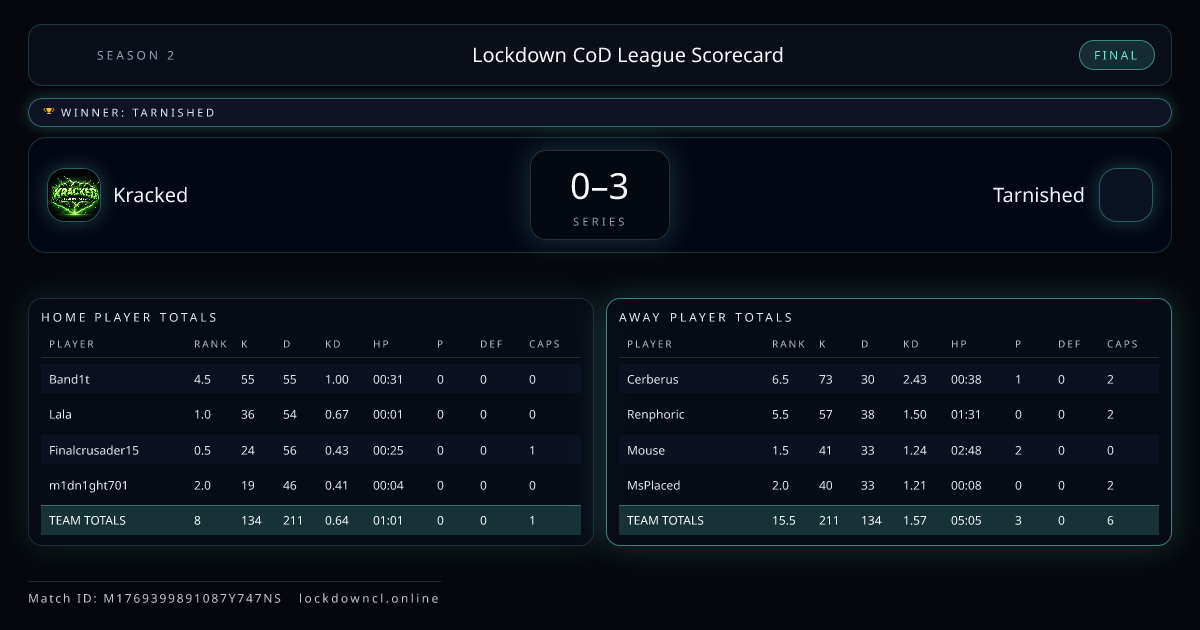 Scoreline: 0 - 3Winner: TarnishedMatch ID: M1769399891087Y747NS