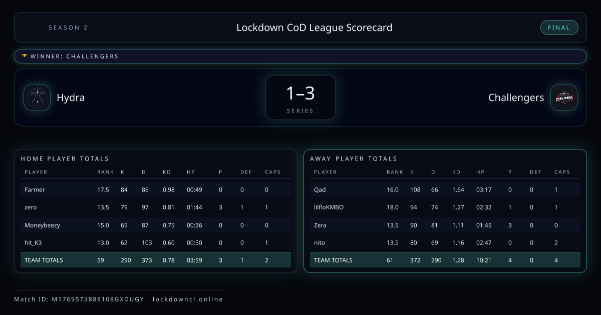 Scoreline: 1 - 3Winner: ChallengersMatch ID: M1769573888108GXDUGY