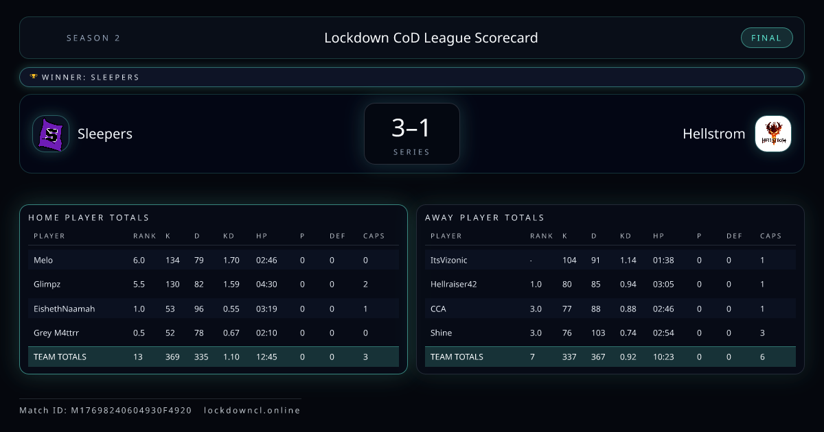 Scoreline: 3 - 1Winner: SleepersMatch ID: M17698240604930F4920