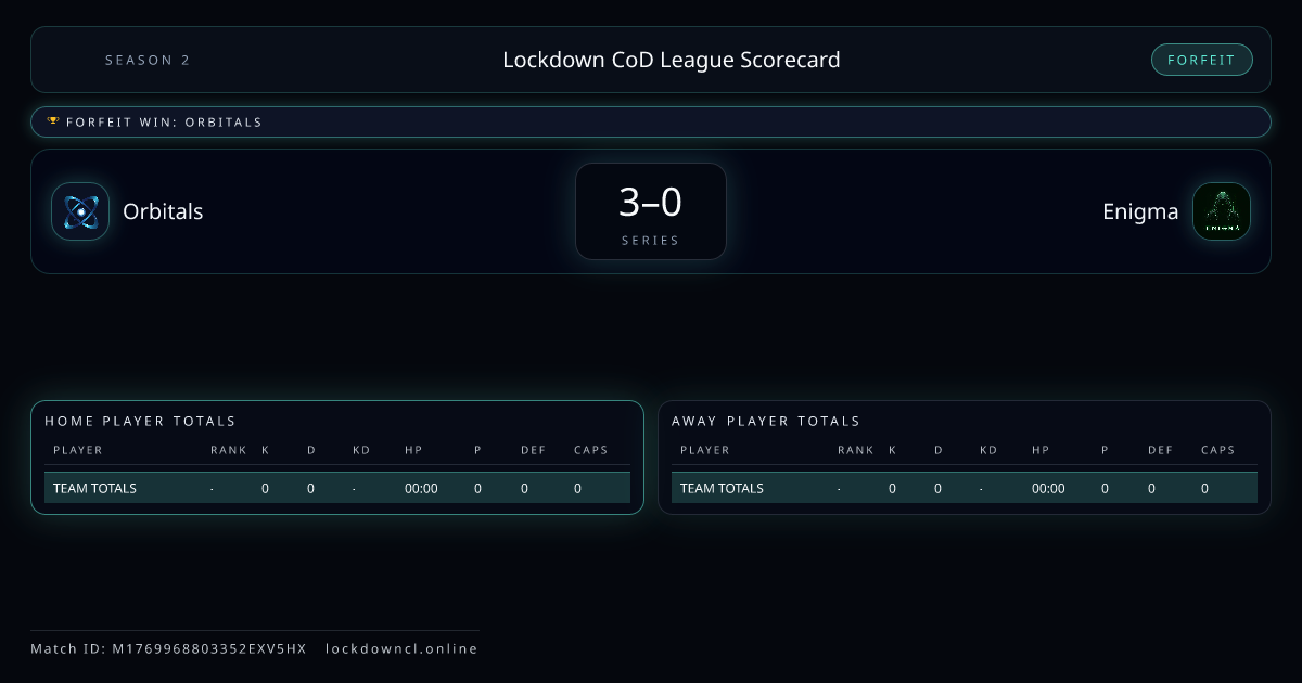 Scoreline: 3 - 0Winner: OrbitalsMatch ID: M1769968803352EXV5HX
