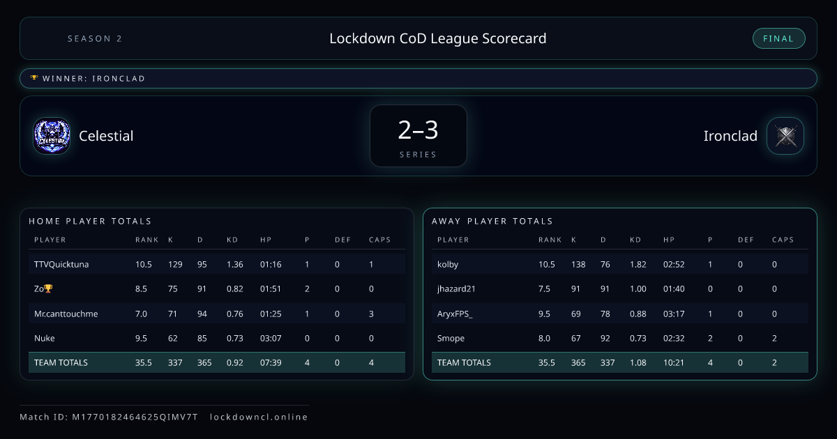 Scoreline: 2 - 3Winner: IroncladMatch ID: M1770182464625QIMV7T