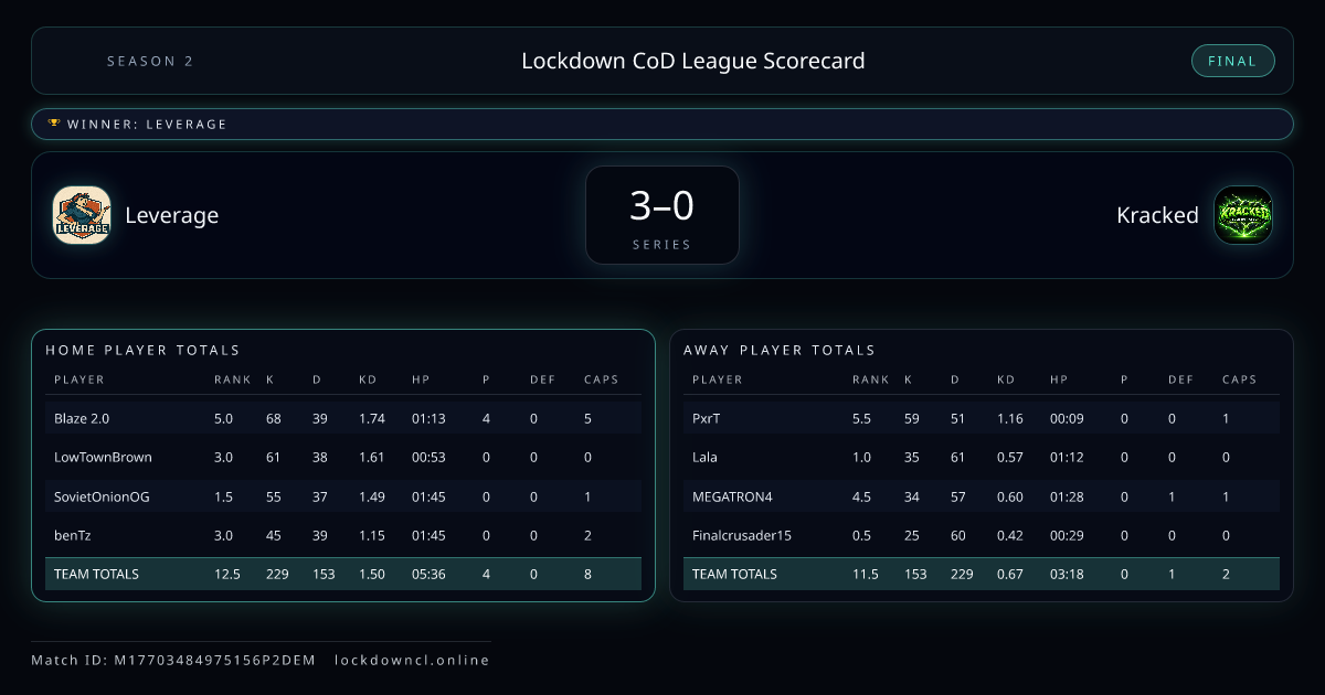 Scoreline: 3 - 0Winner: LeverageMatch ID: M17703484975156P2DEM