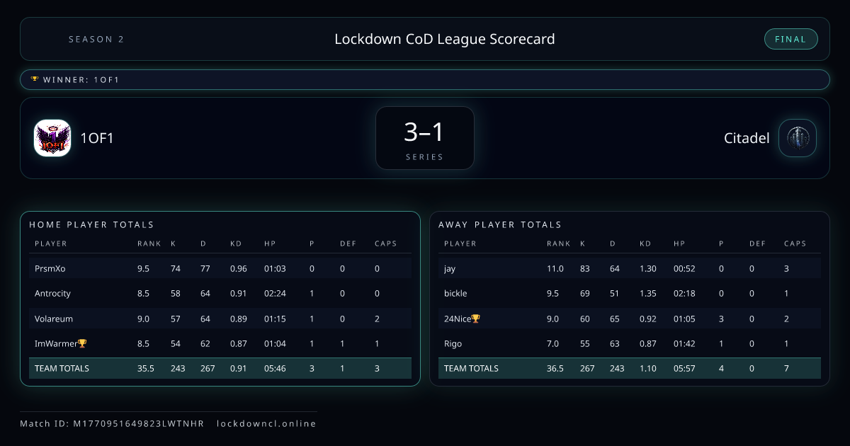 Map 4: Scar (Hardpoint)Score: FORFEIT · Winner: 1OF1