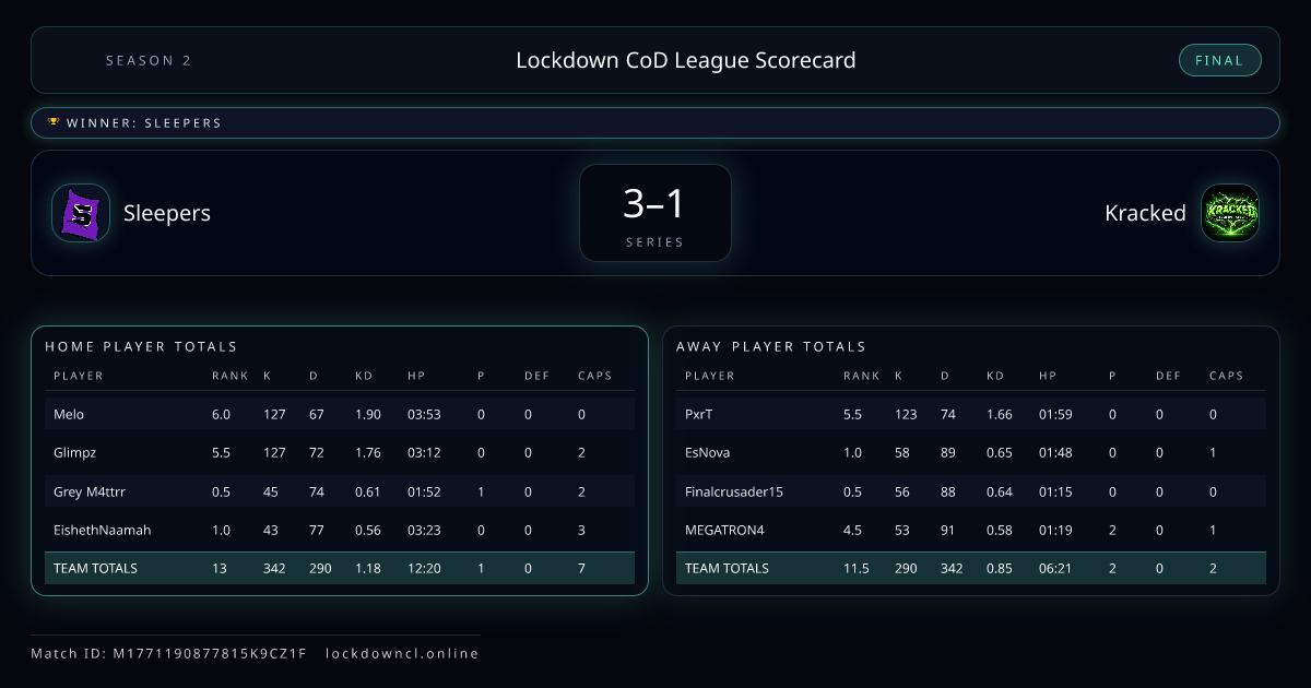 Scoreline: 3 - 1Winner: SleepersMatch ID: M1771190877815K9CZ1F