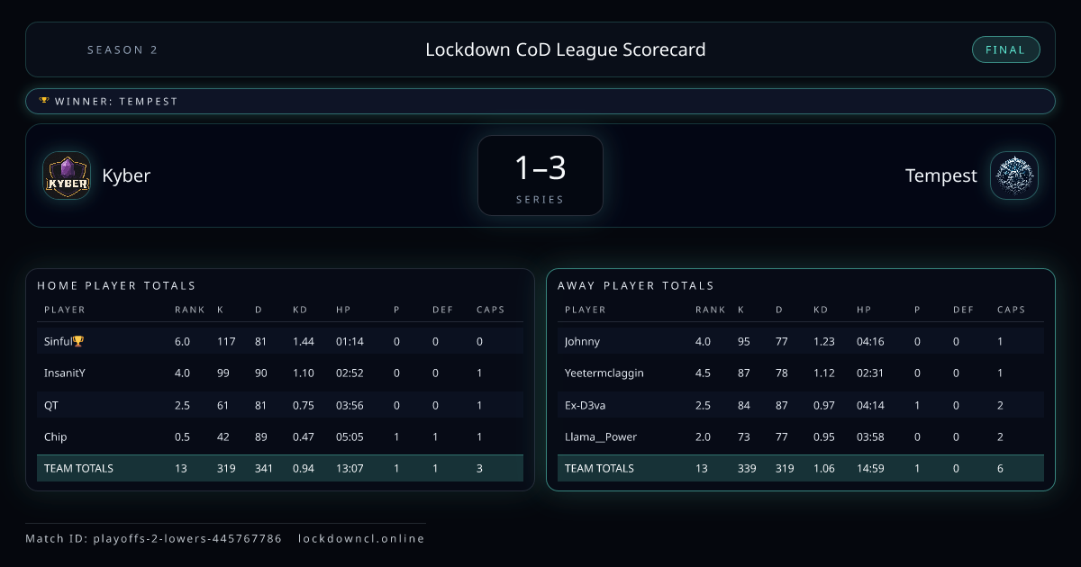 Scoreline: 1 - 3Winner: TempestMatch ID: playoffs-2-lowers-445767786