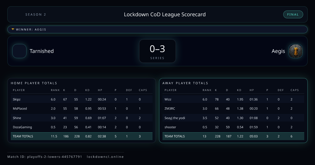 Scoreline: 0 - 3Winner: AegisMatch ID: playoffs-2-lowers-445767791