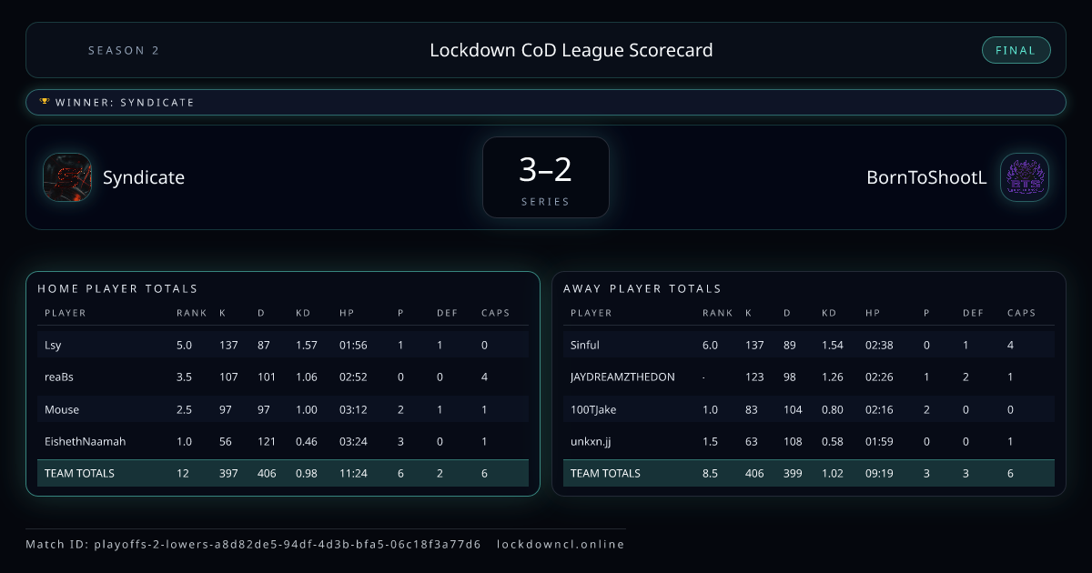 Scoreline: 3 - 2Winner: SyndicateMatch ID: playoffs-2-lowers-a8d82de5-94df-4d3b-bfa5-06c18f3a77d6
