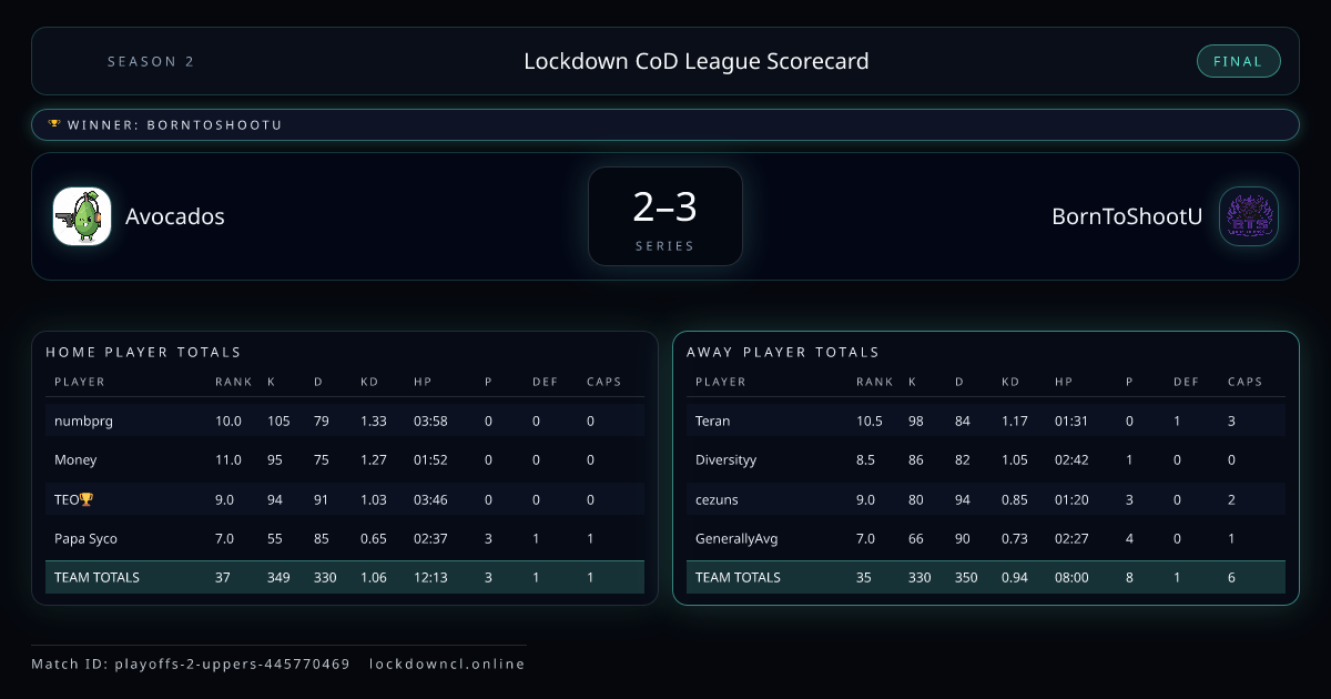 Scoreline: 2 - 3Winner: BornToShootUMatch ID: playoffs-2-uppers-445770469