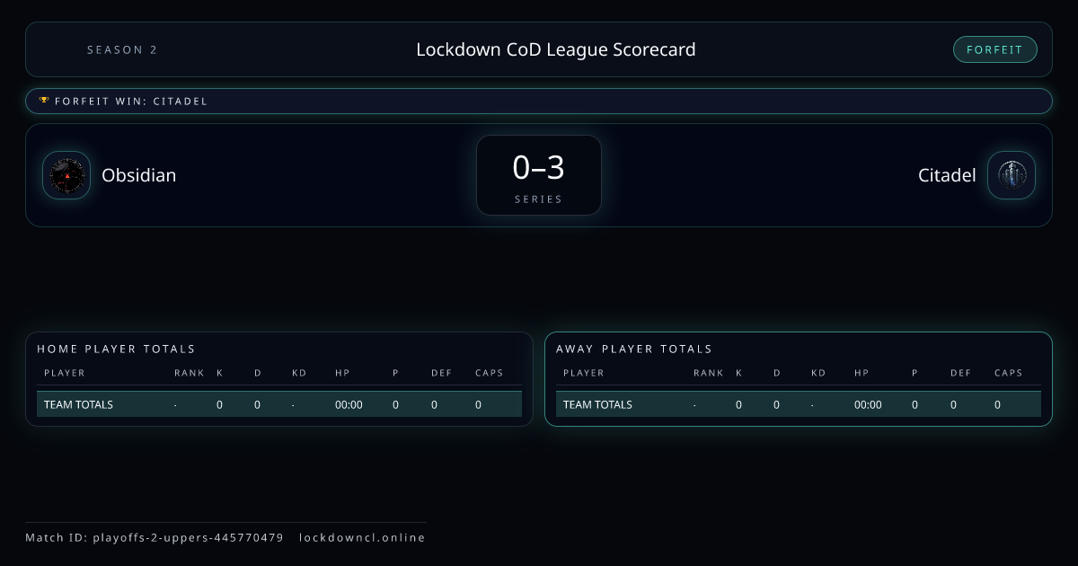 Scoreline: 0 - 3Winner: CitadelMatch ID: playoffs-2-uppers-445770479