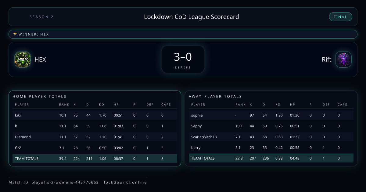 Scoreline: 3 - 0Winner: HEXMatch ID: playoffs-2-womens-445770653